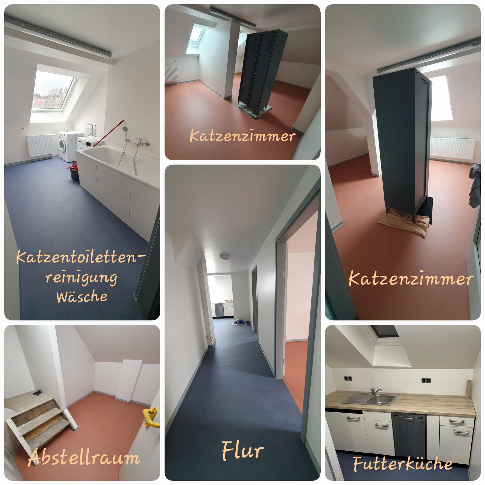 Die zwei oberen Etagen, wo die zukünftigen Katzenstationen sind, werden gerade noch gereinigt und ausgestattet. Es fehlen nur noch ein paar Kleinigkeiten.